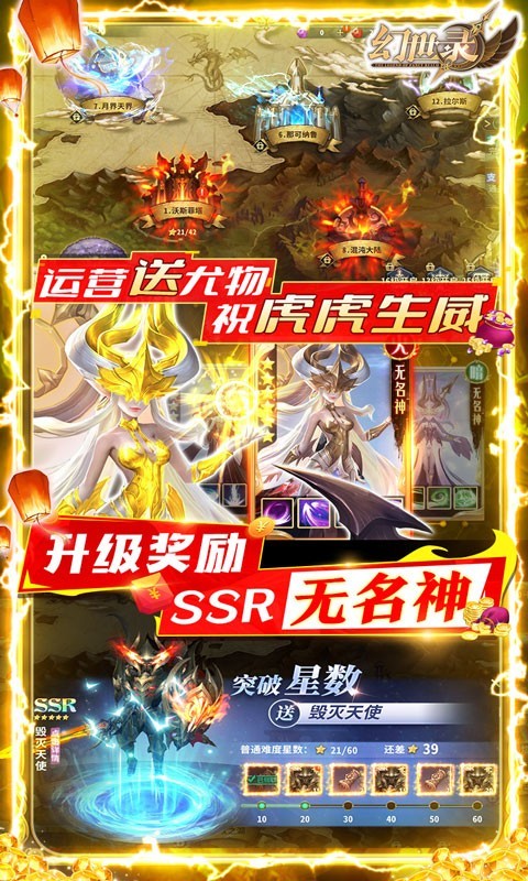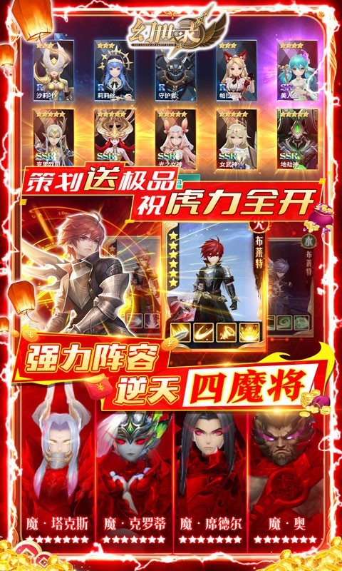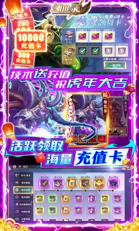 幻世录满v版是一款超人气火爆的卡牌回合制手游。玩家创角赠送满级VIP、强力阵容-四魔将、红水晶*188888、4套紫色力量符文、凡品经验书*188,让你开局直接起飞!收集图鉴领取10000元充值卡,主线成就赠送SSR阵容,升级送强力SSR,活跃赠送充值卡。
