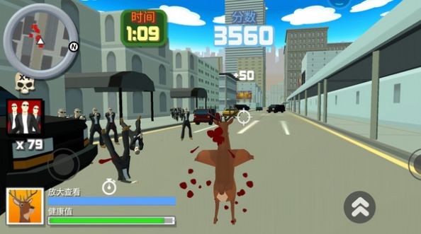 疯狂的鹿大作战,在荒野的城市里进行一系列的闯关冒险,这里还有很多的探索和闯关冒险可以安排哦,游戏中还有超多的武器道具可以选择的,你身为一个喜欢恶搞的鹿,可以来通过自己的操作对这个城市进行一系列的惩罚哦,来试试吧。