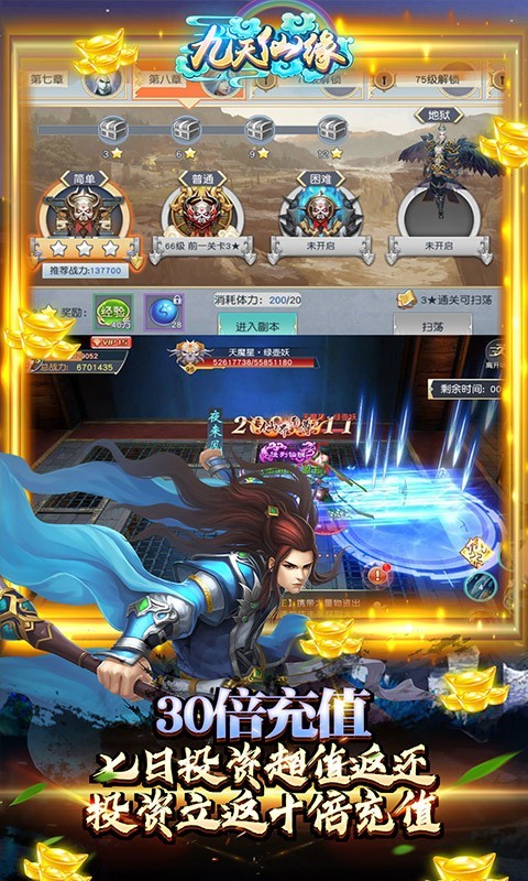 九天仙缘最新版是一款仙侠题材的3DMMOARPG手游。玩家上线就送满V和648元真充卡,升级再送5000充值、进阶材料*9999。累积登陆送万元真充、仙女-貂蝉,元宝多多,福利满满。你将在游戏中控制你的角色来完成不同的挑战,体验精彩有趣的剧情内容,赶快来下载开启你的仙侠冒险之旅!