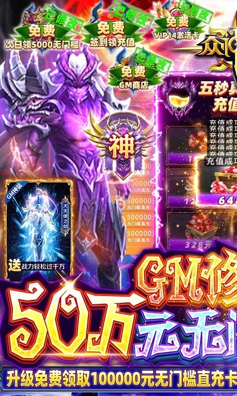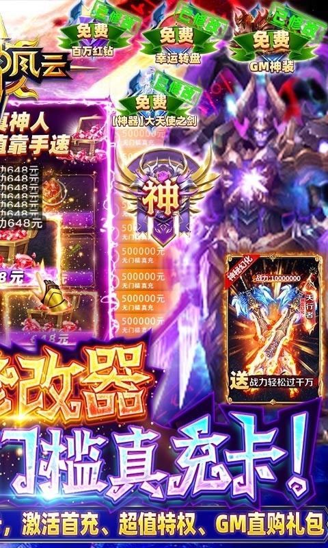 众神风云无限版是一款BT福利的魔幻RPG游戏。玩家次日登录领5000元无门槛真充卡、稀有坐骑、极品圣兽、酷炫时装。每日签到、闯关、活跃送充值卡,更有GM修改器、全套超强成长GM神装可以获得。参与幸运转盘活动、百万红钻扶持计划可免费抽真充卡碎片、海量极品材料、百万充值红钻。