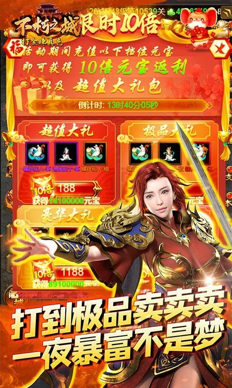 不朽之城打金版是一款全网唯一三十六转玩法的竖版传奇巨作。内含专属宝地,打金免费打出真充卡、至尊雷霆套装、时装、战灵等极品道具!全新主宰者特权,更有绝版时装、元宝、传世神装、特戒、极品材料承诺终生免费无限送!