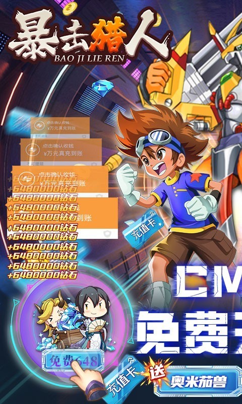 暴击猎人福利版是一款动漫题材的动作冒险类手游。玩家上线送VIP7、GM神权、金币一亿、钻石888万、三选一主宠数码兽。钻石拿到手抽筋,更有大礼送无限连抽。以数码宝贝为背景,打造一个真实的战场,独立的队友、坐骑的养成,带给你非凡的数码暴龙体验。玩家将在这个奇异的数码世界展开你的冒险吧!