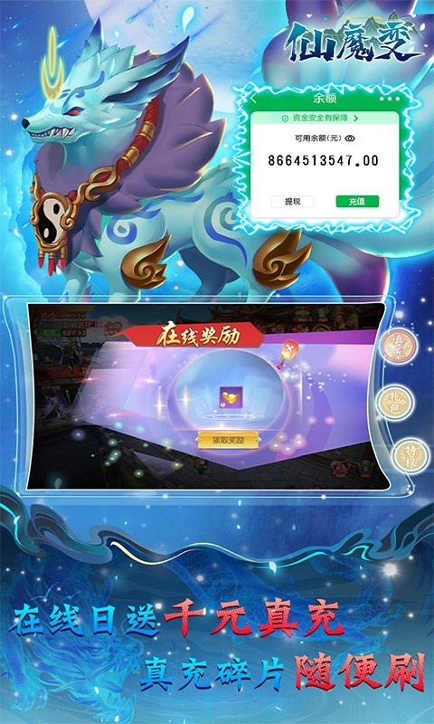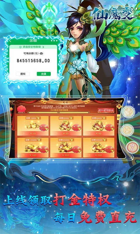 仙魔变打金特权版是一款西游题材的冒险仙侠手游。开局可以直接使用网管打金卡,免费获得每日打金额度,开启刷充之旅。每日在线累计领取千元真充,挂机无限刷真充卡碎片,元宝根本花不完,碎片可合成真充卡,活动统统全部免费领。全新的剧情内容,组队冒险来完成不同的任务,魔性轻松的玩法。
