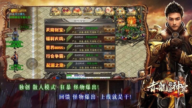 副本可以掉落大量物质金钱,所有怪物都有机会掉落充值红包。首爆系统首爆奖励一千块赚,世界BOSS掉落专属宝箱开启大量专属装备。