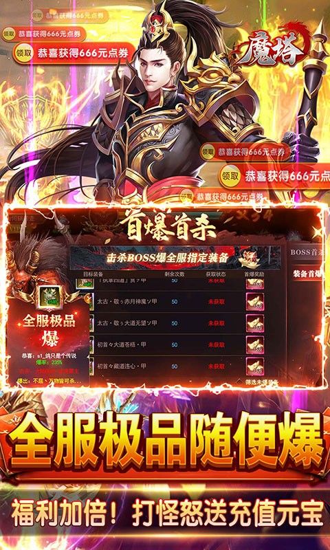 1.上线就送无限直充特权,千元直充劵免费送,使用获得千万元宝,砍BOSS直送V15。
