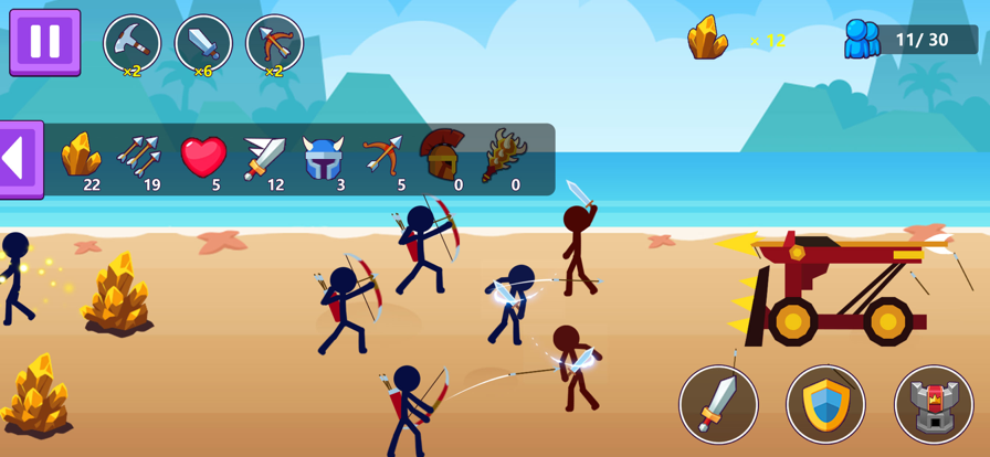 火柴人部落苹果版,一款玩法不错的火柴人战争竞技冒险游戏。火柴人部落苹果版游戏汇集了很多的火柴人,这里还有大量的敌人和boss出现的,选择自己的道具和武器装备生产更多的士兵吧。前期先挖矿,发展自己的竞技,再开启自己的火柴人战斗。