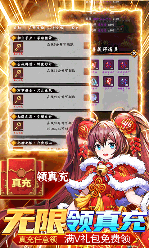 单日累计充值100元:注灵石*100,精炼石*200,紫色兵书宝箱*1;