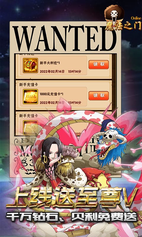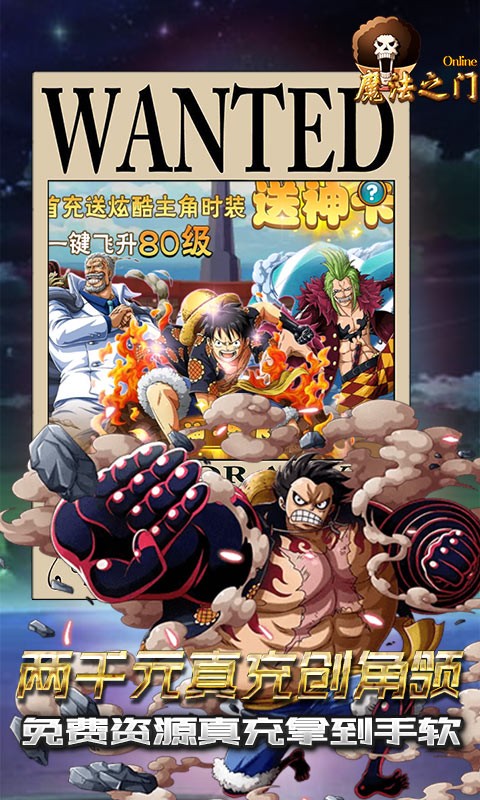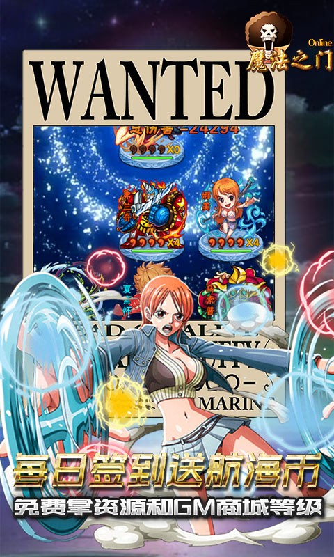 魔法之门OL巴兔版是一款正版授权高度还原《海贼王》动漫的策略卡牌回合制手游。全新称号、时装系统,上阵卡牌全加成。上线就送至尊V、千万钻石、贝利,登录就送千元真充卡。每日签到送航海币,开启无限资源商店,无限领取奖励。全新基金系统一经激活,每日可领超值资源豪礼。在线送充值卡,完成每日任务可领超值资源道具及航海币。