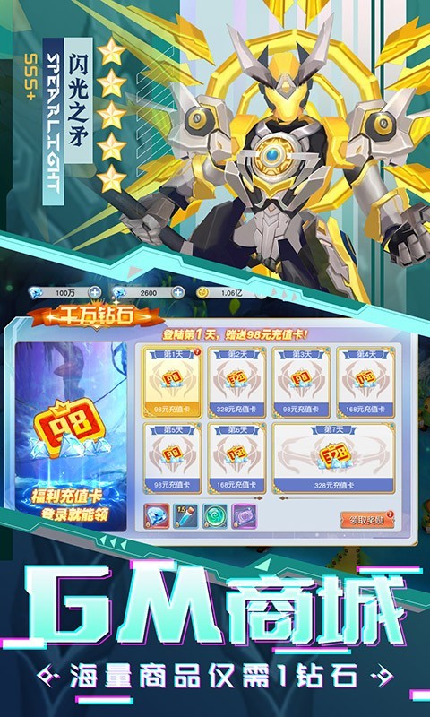 单日累充1000元:【橙色图鉴礼包*2、机甲能源*1、光谕套装石礼包*3、副手破甲丹*3、高级翅膀升级丹*1】*5