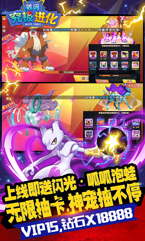 究极数码进化巴兔版是一款超多福利的卡牌冒险类手游。累计登录即送UR勾帕路翁、闪光-妙蛙种子、神级精灵-暴鲤龙。升级即可领取万元充值卡,精灵扭蛋全新升级,将有机会获得神级宠物。激活月卡、绝版礼包、天王旅程卡就送充值卡、海量钻石、神秘宝箱、神·超能妙喵、红色极品装备、水君、闪光精灵碎片。