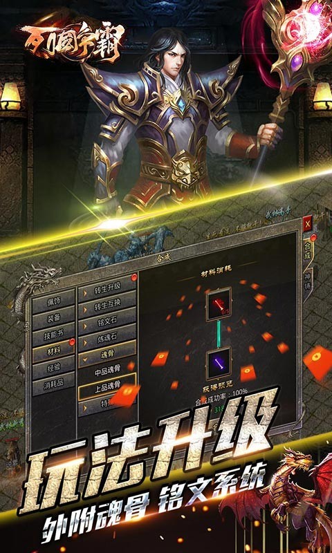 2、玩法升级,全新的铭文系统,外附魂骨,拥有公会争霸、百人团战、自由pk等等精彩玩法。