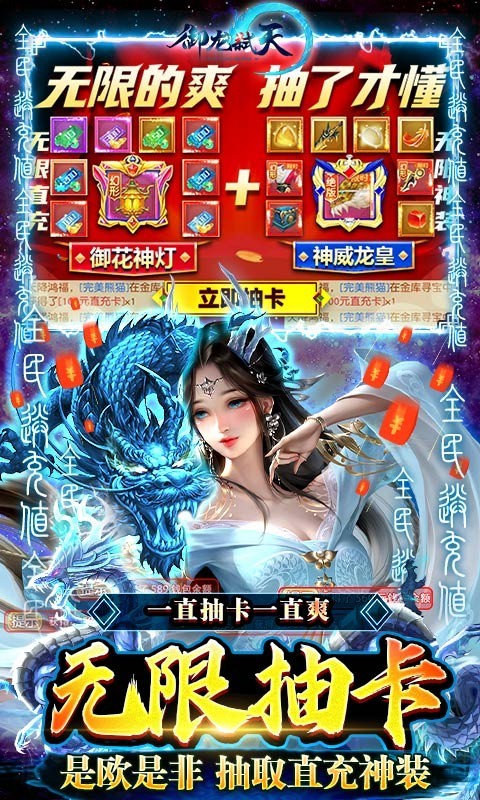 御龙弑天新版一款东方玄幻修真MMORPG手游。全新1000%超速打金来袭,全方位免费首充。上线领取10000元直充卡、超级进阶宝箱,累计充值送无限金币、神玉、灵玉。日常活跃领天天抽真充,在线送巨量寻宝令,更有GM武器、极品装备统统免费送。