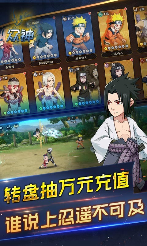 2、招募强力的英雄角色,在战斗中可以自由搭配不同的阵容,打造专属你的忍者小队。