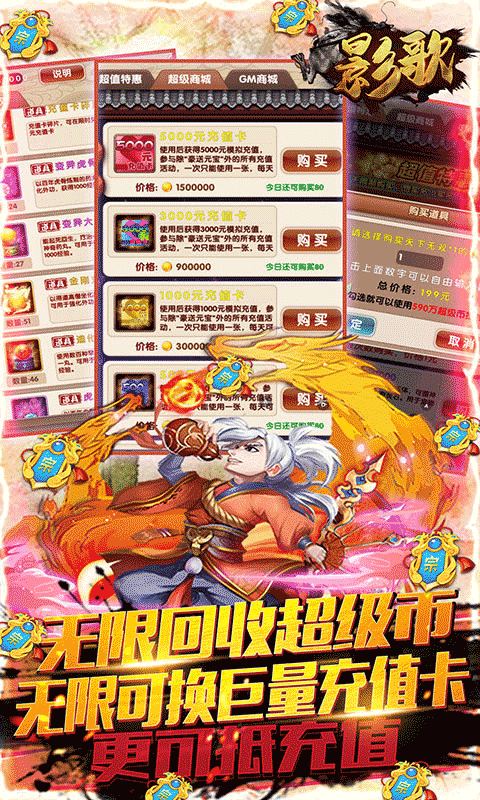 影歌宗师令狂兑是一款巅峰武侠卡牌题材的手游巨制。上线直接赠送GM特权、元宝*10000、银币*10000000。独家赠送最强真·充值卡,每日签到送充值卡,角色升级送充值卡,让你不花钱也玩的爽。最变态特权,每日领5000真充卡、100宗师令,元宝天天拿,宗师日日换。
