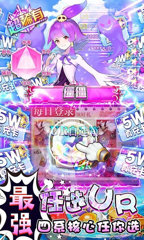 2、自由招募卡牌伙伴,拥有来自不同的种族、国家、属性、技能的角色,随意搭配合击阵容。