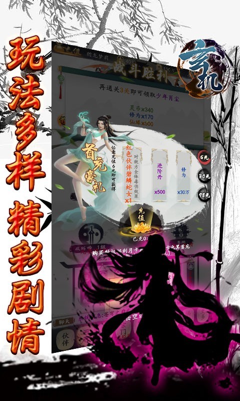 2、玩法多样,拥有个人英雄、宗门之战、斩妖除魔、炼丹炼器、得道升仙等精彩玩法。