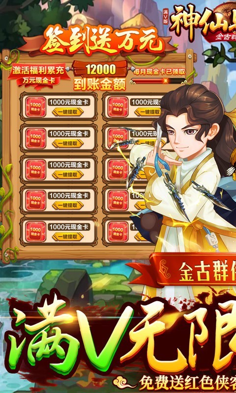 神仙与妖怪修仙版是一款武侠题材的卡牌手游。开局免费送红色侠客自选*1,每天在线都送280元真充卡和200抽寻宝券。每月免费送12000元真充卡、红侠碎片、120000元宝。