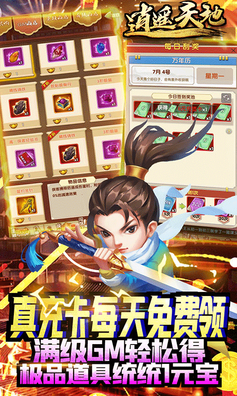 逍遥天地官方版是一款还原武侠小说剧情的角色扮演类游戏。上线赠送GM1、元宝*88888、全宝物礼包,助你战力突飞猛进。每日免费领真充卡,满级GM轻松得,极品道具只需1元宝。激活大侠令可获得专属特权以及额外奖励,至尊卡可选3大超强红卡,成长基金豪送元宝。幸运盲盒有机会获得最强侠客,部分副本也可获得充值卡。