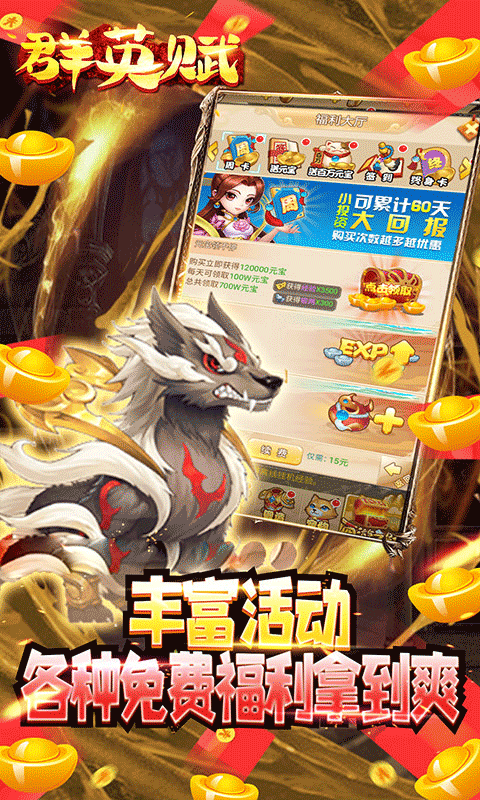 群英赋OnLine最新版是一款超变暴力修改的Q版卡牌类手游。上线直接送满V、1000万绑元、1亿银量、顶级宝宝上古瑞兽。每日活跃送500w元宝、红装碎片,不花钱一样可以弄顶级。商城材料随便买,元宝抽奖无限制,海量福利等你来拿。