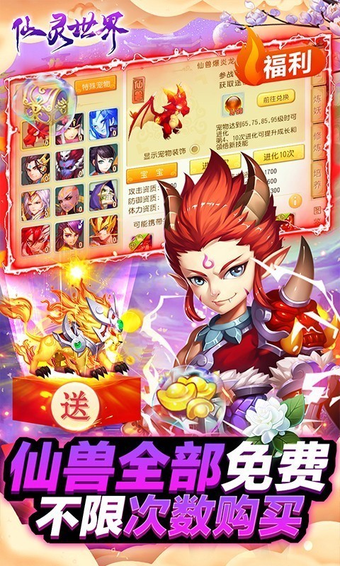 仙灵世界满V版是一款超强福利的经典回合制手游。开局免费破解GM特权,极品道具随便刷。所有顶级仙兽全部无限免费领取,让你不氪金也可以当大佬。全新海量商店系统,所有道具均在商城中贩卖,每天即可花费1元宝获得养成道具。