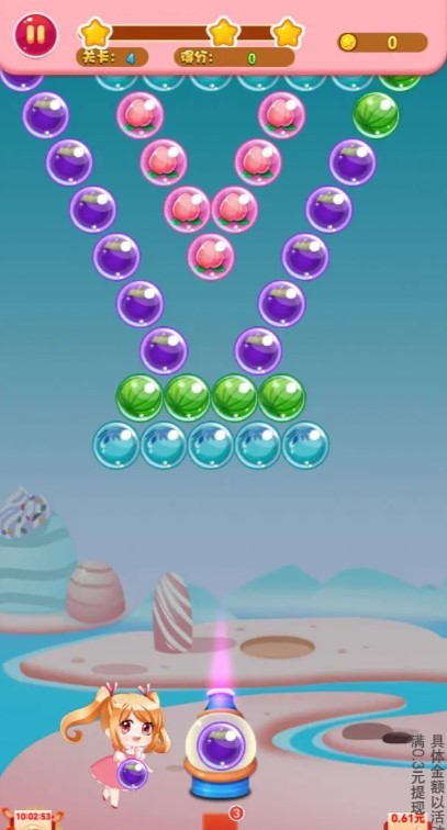 游戏里面还有独特的画质,精美的背景音乐体验,一起在线签到、享受内置独特的排行榜,连钱领取福利就可以得到称号,快速的尽情闯关吧,每个泡泡击破就可以得到红包,兑换出惊人的福利,任何背景都可有灵活切换,冷静下来思考对策吧,随时挑战任务。