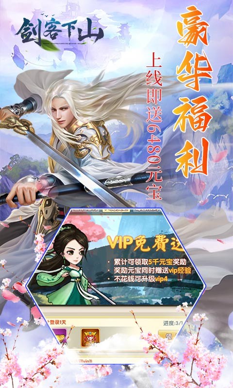 剑客下山官方版是一款武侠题材的角色扮演类手游。上线即送6480元宝,七天登录送VIP4。线下白嫖至尊卡,累计可领取5千元宝奖励,同时赠送vip经验,资源轻松获取,轻松升级无压力。