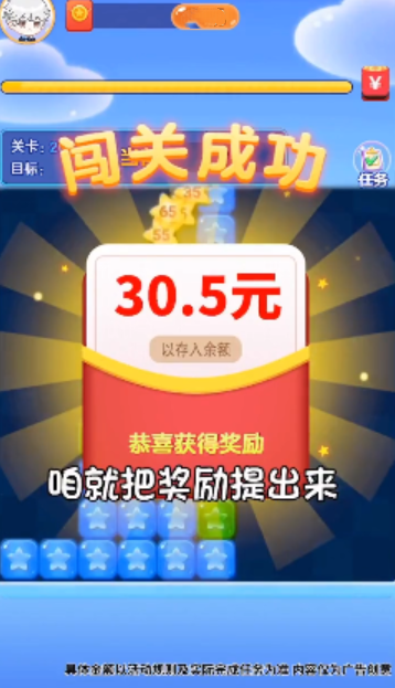 1.在关卡中进行消除挑战,完成任务后就能获得非常丰厚的红包奖励,不断解锁更多的关卡进行挑战。