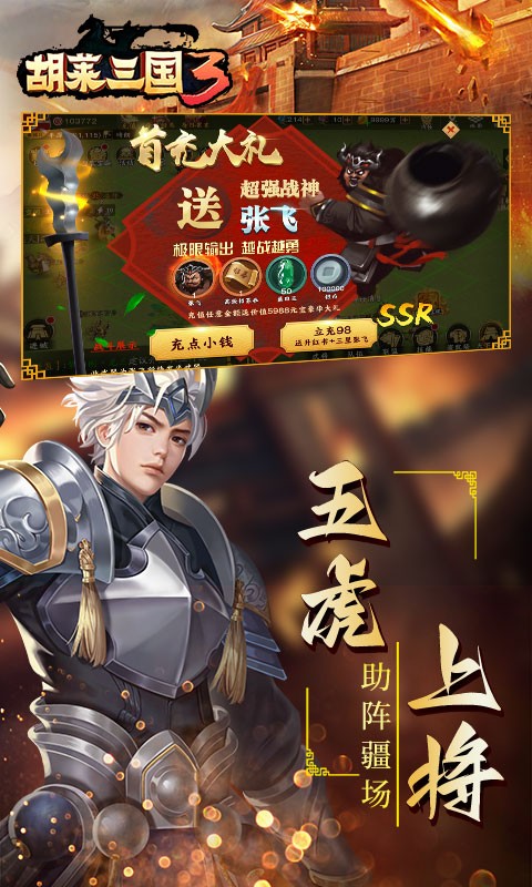 2、五虎上将助阵,兄弟齐心,攻城略地,跨服征战,血战沙城,策略为主。