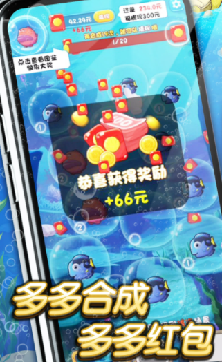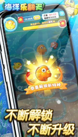 这款游戏玩家可以在海洋的世界里进行冒险的探索,不断的将小鱼进行合成,变成更高级的鱼类,获取丰富的收益,每一次的挑战带给自己意外的惊喜,解锁全新的游戏模式,体验趣味十足的游戏过程,随着游戏的升级难度也会有所增加,提高自己的操作技巧。