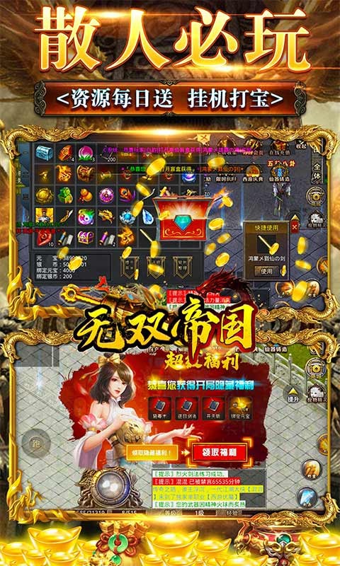 无双帝国终极版是一款具有挑战性的能够让玩家在这里参加各种战斗的动作冒险类游戏,一款西游复古传奇,源自1997年街机西游度厄传的背景,融入进传奇中,这款游戏受到更多玩家的喜爱,每一个玩家都能够自由的在这里打造自己的传奇人生,与更多的boss进行对战,也能够不断的斩妖除魔,让自己快速的在这个世界上成王成霸。