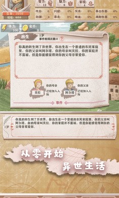 穿越回另一个世界,随机分配一个身份,在这个刀光剑影的世界里从零开始一步一步的成长冒险。游戏中有很多分支游戏,每一个选择都会影响后续剧情的走向。