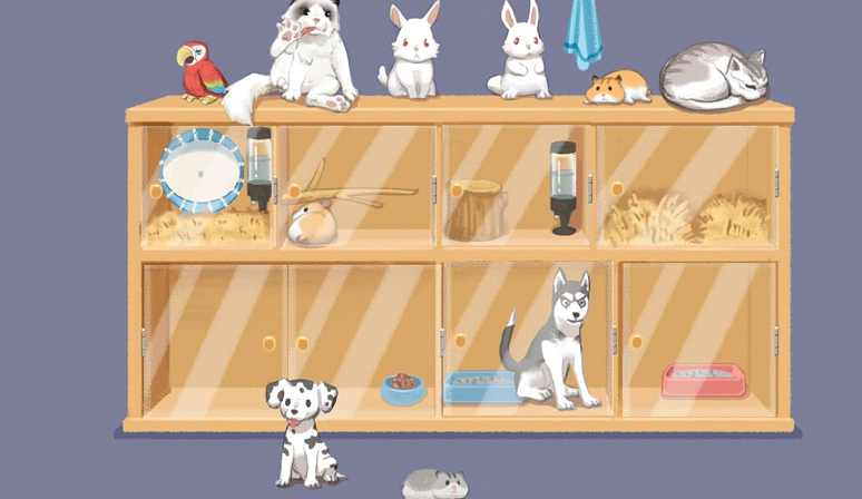 2、第2步,灰色的仓鼠放在左上方的柜子跑步机上面。