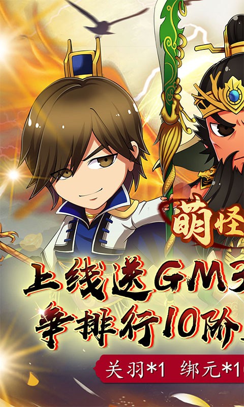 上线福利:送GM3,关羽*1、元宝*100万、绑元*100万、铜钱*10亿