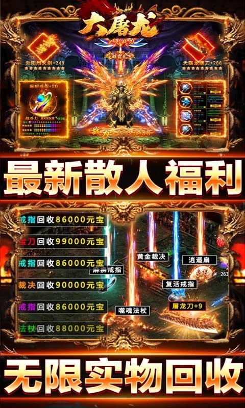 大屠龙无限刀传奇是一款经典的传奇类游戏。在大屠龙无限刀传奇中完美复刻端游,超高人气的玩法全部都有,一秒十刀,刀刀爆装,妈妈再也不用担心我的装备不是极品了!一键挂机,离线爆仓,当年岁月再回首,叫上兄弟们征战玛法大陆,享受大怪小怪通通爆极品的岁月。