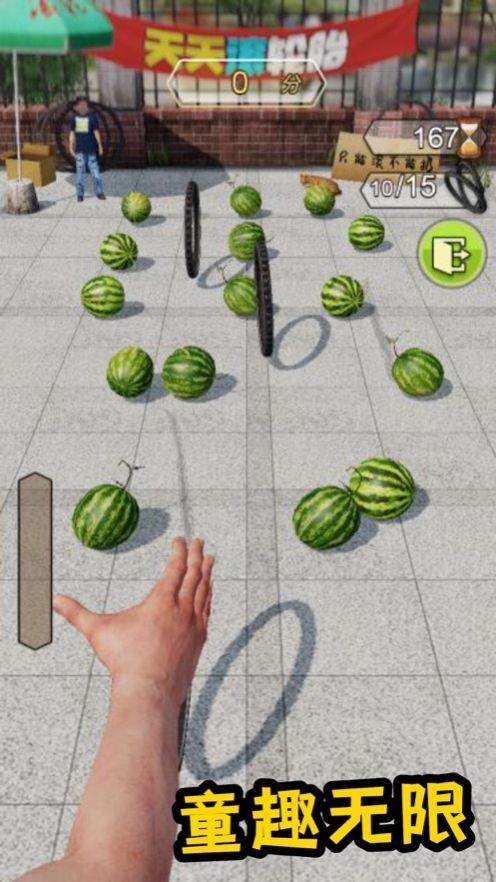 1.站在指定位置,控制好力度和角度,用套圈套种物品。
