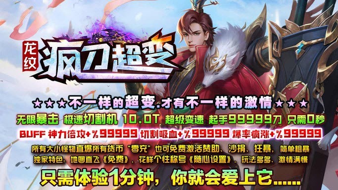 龙纹疯刀超变,一款玩法不错的超变版本传奇竞技冒险游戏。龙纹疯刀超变游戏内容丰富,很多的装备武器可以升级和刷图来获得。加入活动,门槛低,玩法丰富,没有体力值限制,玩家可以自由享受副本战斗。提高buff,享受全新战斗。