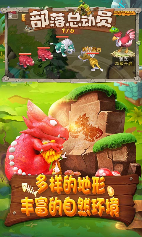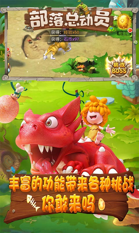 部落总动员送福利游戏的难度不大,可以快速的上手,让大家在这里搭建房屋,制作出温馨的小窝,可以成为自己的庇护所,会有各种暴龙可以选择,让他们在战斗的时候给你提供帮助,快速的击杀对手,拥有不同的暴龙形象,能够提高你的攻击力和爆发力,整个游戏的体验感非常不错,喜欢的不要错过。