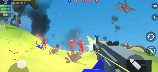 战地像素枪战世界,一款沙盒方块风格的像素冒险游戏。战地像素枪战世界游戏内容丰富,玩法简单易上手,玩家需要通过自己的武器来干掉他们,这里还有更多的射击武器来消灭敌人,蓝色的都是你的对手,杀死他们还可以拾取他们的武器的。