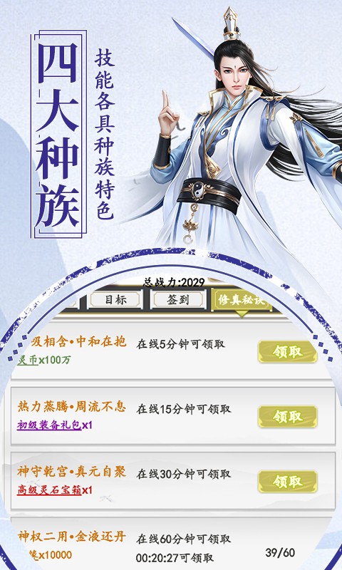 1.展开游戏中的各种玩法尝试,可以通过游行的各种门派绝学来在线进行升级体验。
