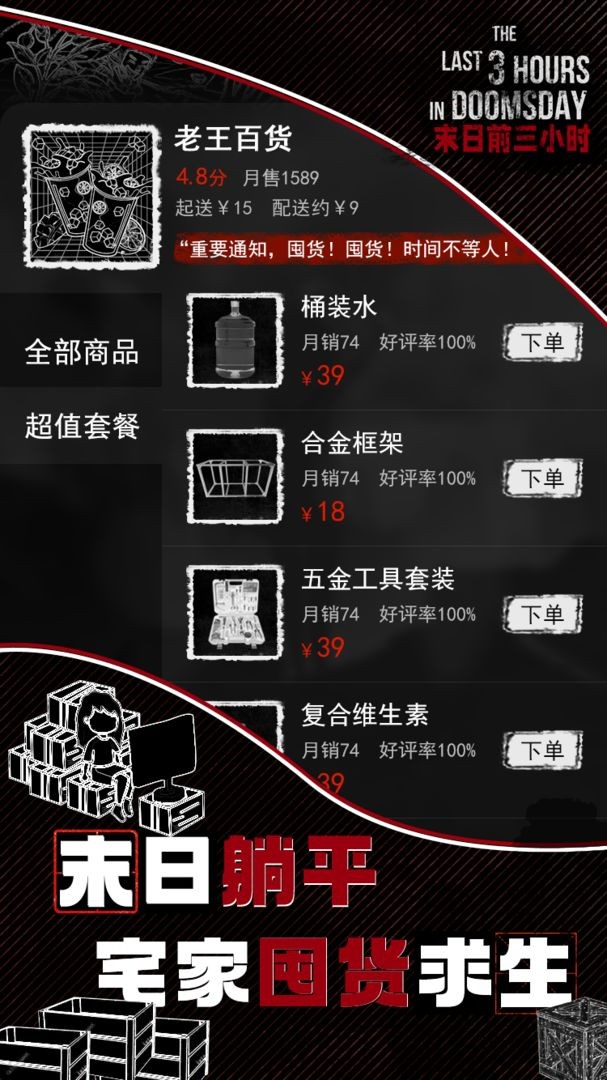 1.末日躺平宅家囤货求生,用所有的积蓄来购买任何你觉得需要的物资吧