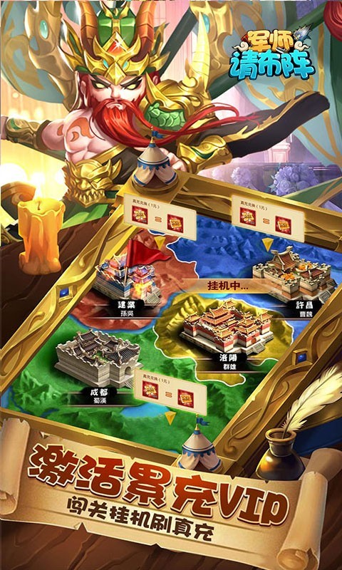 军师请布阵红将全送千抽版,在叱诧风云的三国战场上较量,玩家开局可以获得赵子龙,赵云,三国诸葛亮等英雄角色,各种国家阵营的属性加成,个性鲜明武将卡牌技能,玩家通过各种烧脑操作搭配出上千种阵容组合,全新的招式都使出来吧。