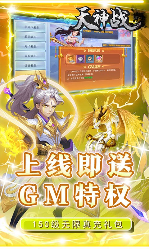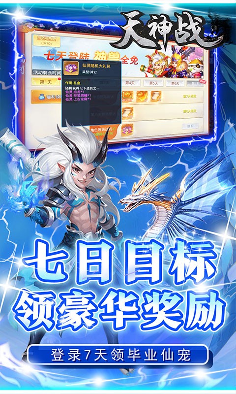 天神战无限领真充是一款上线领真充的全新福利,无限的资源可以获得,每天完成不同的目标,天天领取资源,天神战无限领真充版福利很多,六大主角职业各具特色,相生相克;开局送GM特权,登录7天领毕业仙宠、648充值卡,升级即可享受无限资源,进入魔幻地图世界,一起对战吧。
