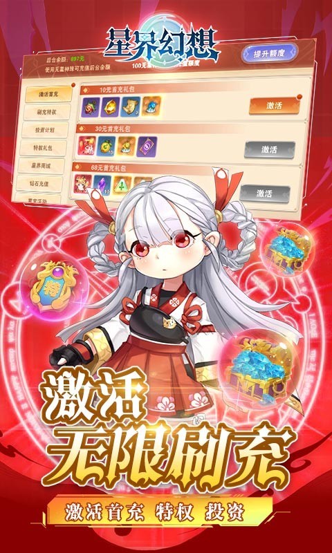 星界幻想送刷充500万,上线送神珠卡、1钻石可兑换惊喜的福利,免费领500万真充福利,整个游戏内容比较丰富,除了基础的选择职业、技能、伙伴属性,还有星灵阵容的组合搭配,组合新的阵容来战斗,一起快乐的冒险、战斗,探索新的区域,寻找更多的宝箱与道具。