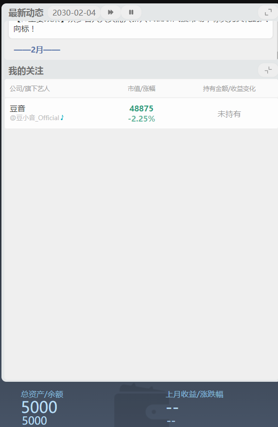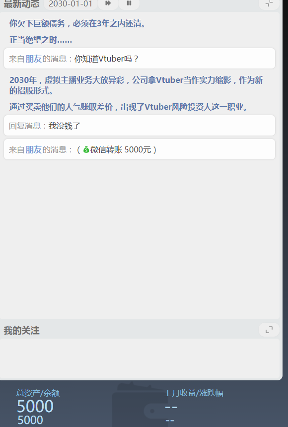 Vtuber小游戏是一款趣味文字H5小游戏,在Vtuber小游戏内玩家们将成为这场游戏的主角,玩家将身负巨额债务,在这里进行我们的投资,你将以低价买入各种股票市场,并从高价进行卖出,获取足够丰厚的游戏收益,丰富的游戏任务主线,等待着你的探索其中!