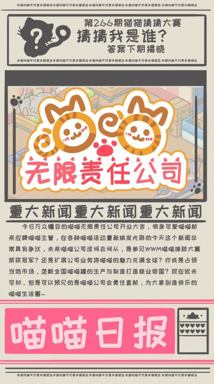 喵喵无限公司游戏是一款趣味休闲养成系经营手机游戏,在喵喵无限公司游戏内玩家们将可以感受可爱的画风,海量可爱的游戏猫猫,等待着玩家们的解锁,加入到我们的冒险世界,体验超强的游戏战力,加入到我们的各项主线任务,帮助我们的公司做大做强!