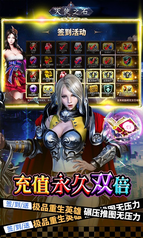 3、充值永久双倍,连续登陆签到再送顶级重生英雄,碾压推图无压力