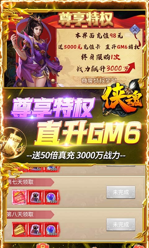 6.开局福利壕送:SVIP10,GM8特权,十年魂环*1,20阶坐骑羽翼礼包,元宝*888888,铜钱1亿!