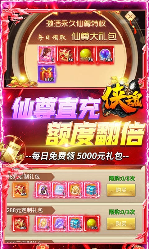 7.全新专属特权:仙尊专属特效称号,提升2000元直充额度,每日免费领取5000元特权专属礼包!