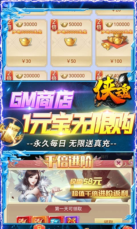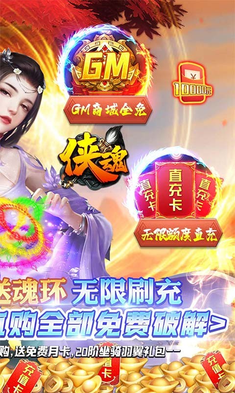 侠魂魂环科技刷充,开局可以获得gm工具,直升gm6,额度翻倍的涨,侠魂游戏可以享受直充的福利,超多的boss消灭掉,真充商城福利等你领取,百变的宠物可以选择,玩家体验超值大礼包,全新的浪漫仙界中冒险,探索不同的环境吧。