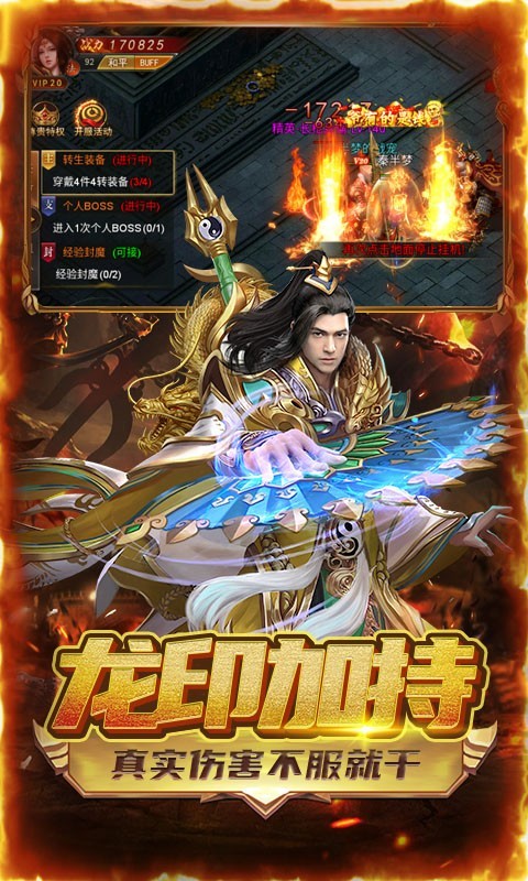 福利设置:上线赠送满级VIP、50万元宝、5000万金币、限定称号绝版属性、每天领千充、打怪无限掉充值卡、完全0氪、给你无比爽快战斗体验;丰富的玩法,打不完的BOSS,极高的爆率让你能够在传奇的海洋里遨游